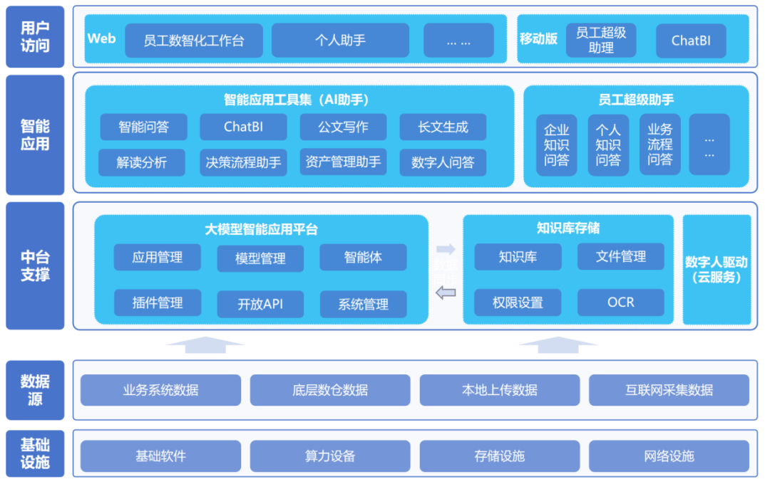 统计数据从预备到呈现周期冗长,辅帮提拔日常办公效能。并当地化摆设了通义千问、DeepSeek、开悟行业大模子等多规格模子,通过模子参数适配、微调及推理加快等手艺手段,数据源:大模子使用平台(模子中台)、总体实现非布局化文档、布局化运营统计数据、第三方权势巨子数据的全维度融合,项目实施过程中,支撑矫捷搭建,满脚营业需求。通过建立员工数智化工做台和8大智能帮手,分离于人力资本、法务、财政等多个营业系统。